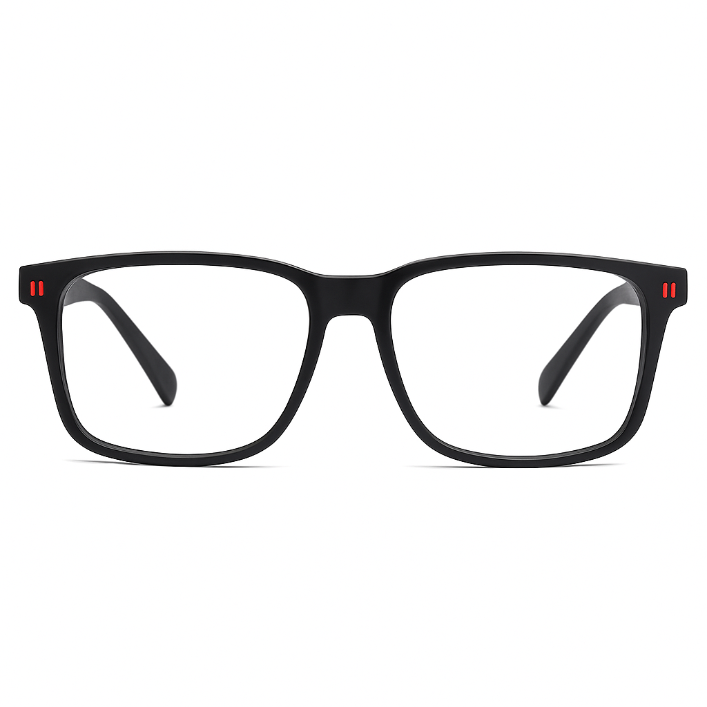 I dettagli rossi sulle aste aggiungono un tocco distintivo al nero profondo della montatura. Perfetto per un uso quotidiano, leggero ma resistente.