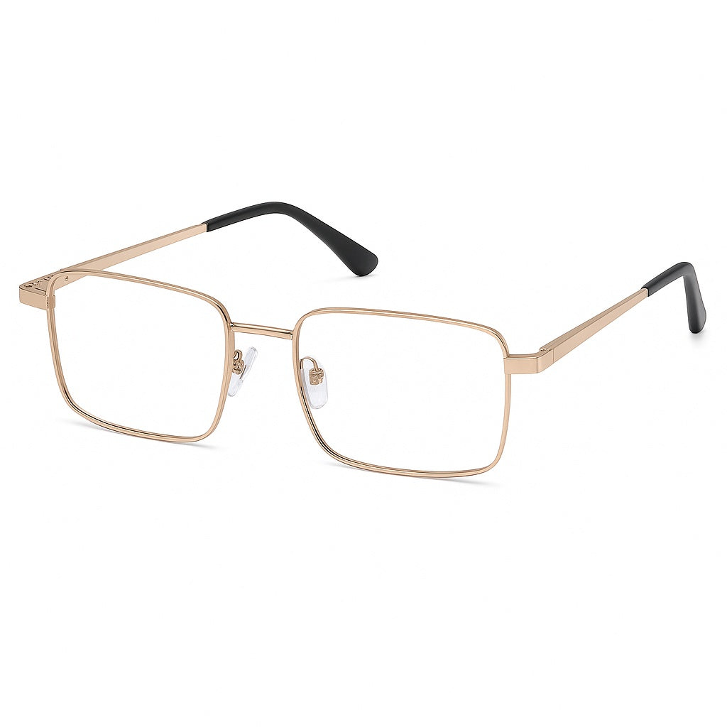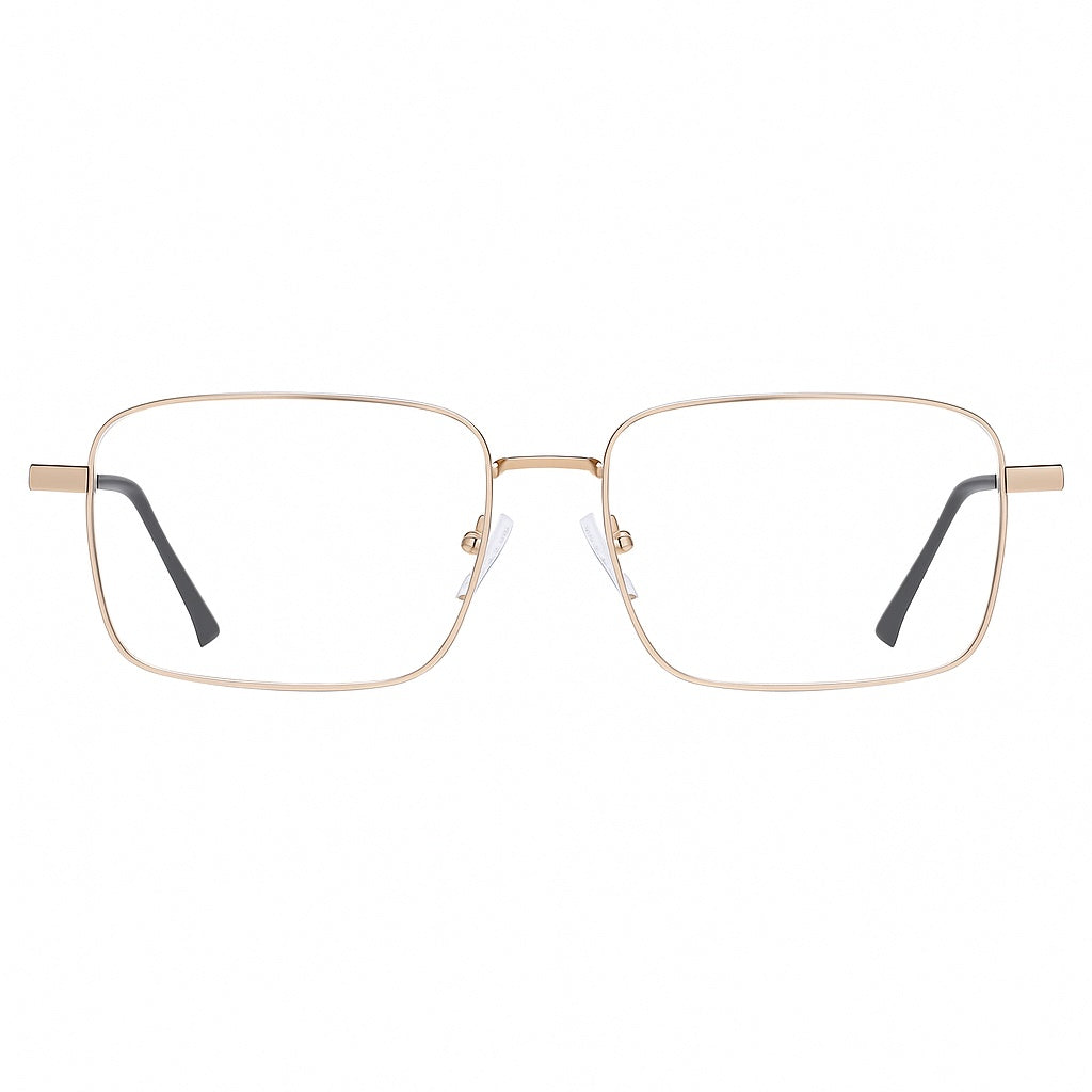Montatura sottile in acciaio con design squadrato e ponte a chiave, leggera e resistente, pensata per chi cerca un look elegante e funzionale.